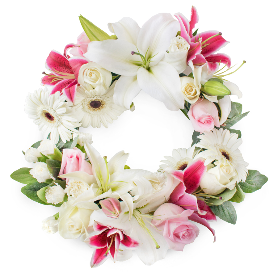 Embrace the beauty and uniqueness of our Elegant Fusion wreath, a harmonious blend of pink, purple, and white flowers. This stunning arrangement features Liliums, Roses, Gerbera, and Carnations, each hand-selected for their superior freshness and quality.