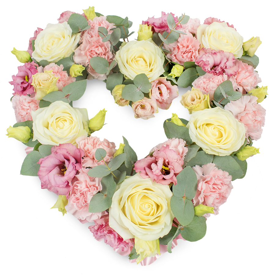 Express your heartfelt condolences with our heartfelt tribute bouquet. This elegant arrangement features a sublime mix of white roses, pink carnations, pink lisianthus, and eucalyptus leaves, each flower hand-picked for superior freshness and quality.
